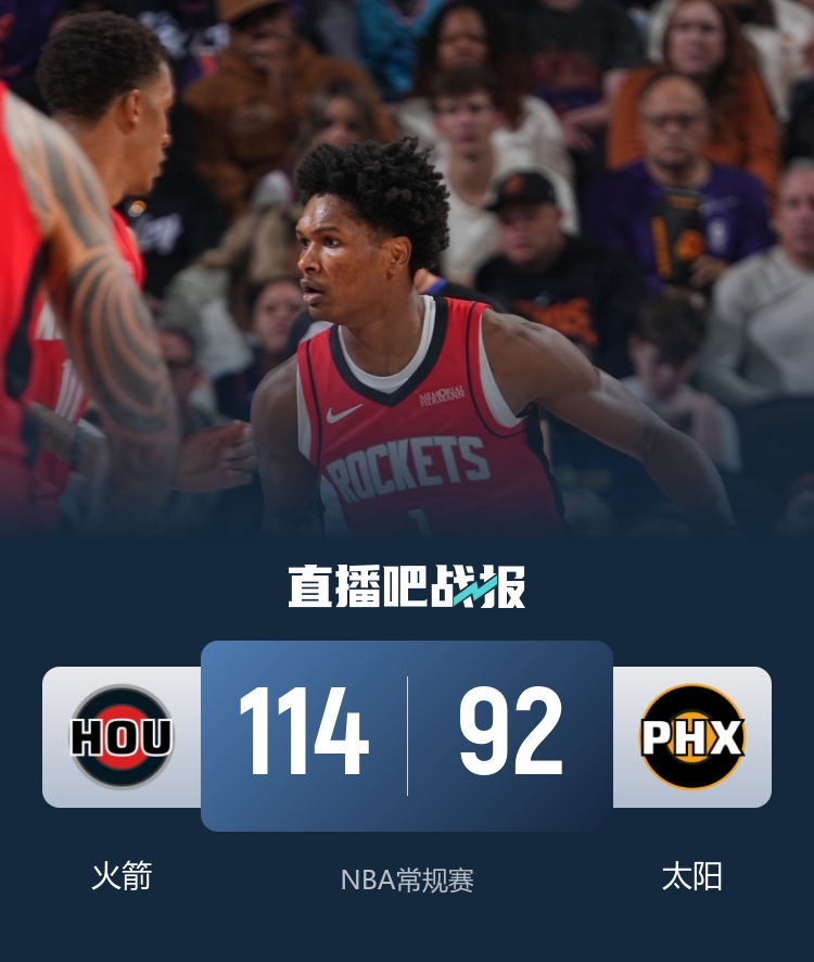 首节之争双方拉锯一路僵持到轮换阶段,霍勒迪成为奇兵连续命中两记三分帮助火箭在这波对决中占据上风;次节双方持续拉锯,火箭一直维持着接近10分上下的优势并带着9分领先进入下半场。休息归来双方继续拉锯战,太阳背靠背作战体能受影响始终抓不住机会,末节初短暂追至6分但没能再进一步,随着火箭三分三连击,他们一波9-1的攻势将分差拉大至19分杀死比赛悬念。最终,火箭客场击败太阳收下比赛。