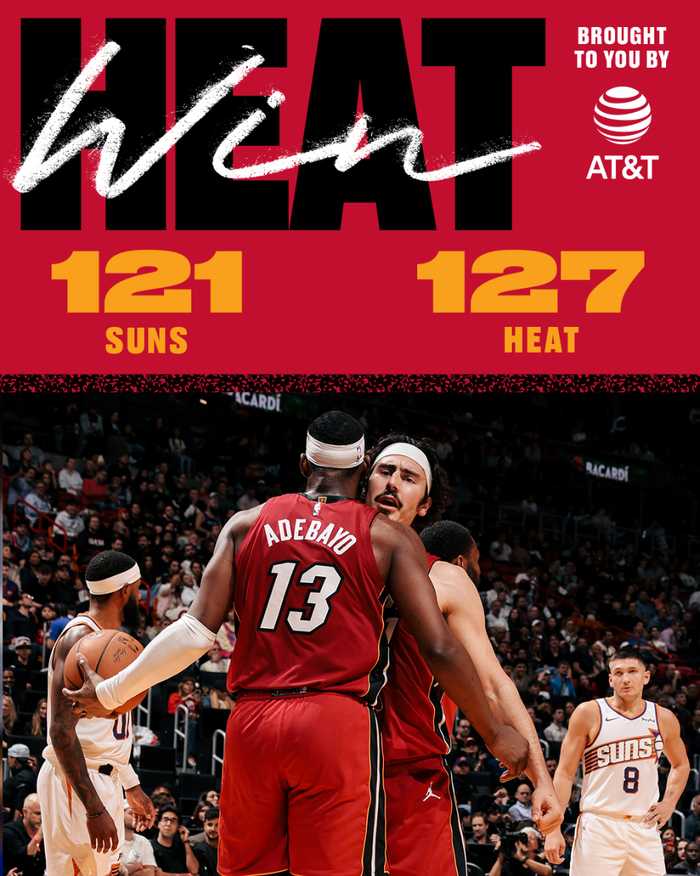 北京时间1月14日,NBA常规赛,热火以127-121险胜太阳。这场比赛是超长拉锯战,两队鏖战至最后一刻,终场前48秒鲍威尔的三分球命中才改变了局势,格雷森-阿伦三分绝平不中太阳拼下了前场篮板 ,狄龙的绝平三分继续不中还吃了一个一级恶意犯规,比赛走向完结。