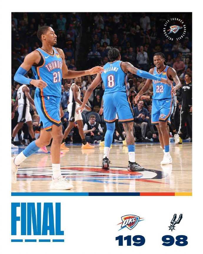 雷霆今天在主场以119-98大胜马刺,取得4连胜,也送给马刺2连败。雷霆战绩来到34胜7负,继续高居西部第一。而马刺虽然继续排在西部第二,但战绩变成27胜13负,又被掘金追平。这场比赛也是雷霆本赛季第4次和马刺交手,前三次雷霆都输给了马刺,而他们总共才输了7场比赛,今天雷霆也以一场21分的大胜成功复仇。