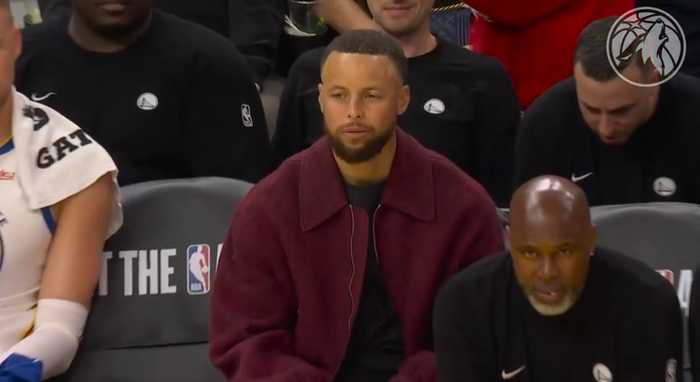 美国媒体晒出视频,当爱德华兹命中三分球后,坐在替补席的库里不停摇头,显得十分无奈。